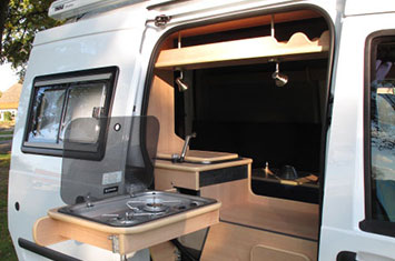 Aan het interieur van de Minicamper hebben wij veel aandacht besteed. Het interieur bestaat uit: 15 mm. multiplex meubelplaat aan beide zijden voorzien van HPL (= High Pressure Laminaat) in de kleuren berken, beuken, kersen of lichtgrijs, fraai afgewerkt met kunststof kantenafwerking in de bijbehorende kleur. Onze meubelpanelen worden met Froli kunststof hoekverbinders aan de binnenkant afgemonteerd, dus zonder in het oog springende houtschroeven met afdekdopjes. Hierdoor ontstaat er een fraai, strak en glad uiterlijk van het interieur.